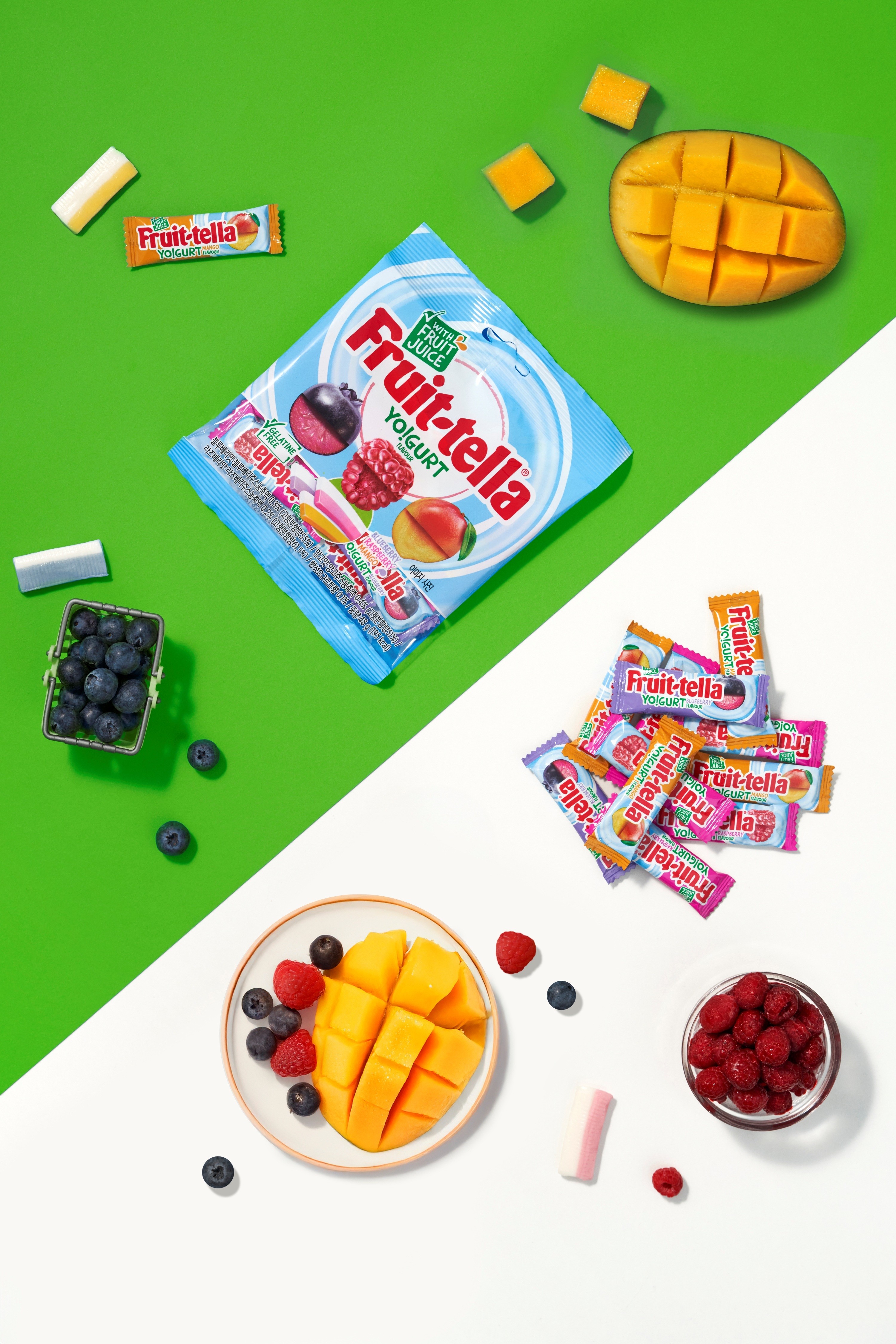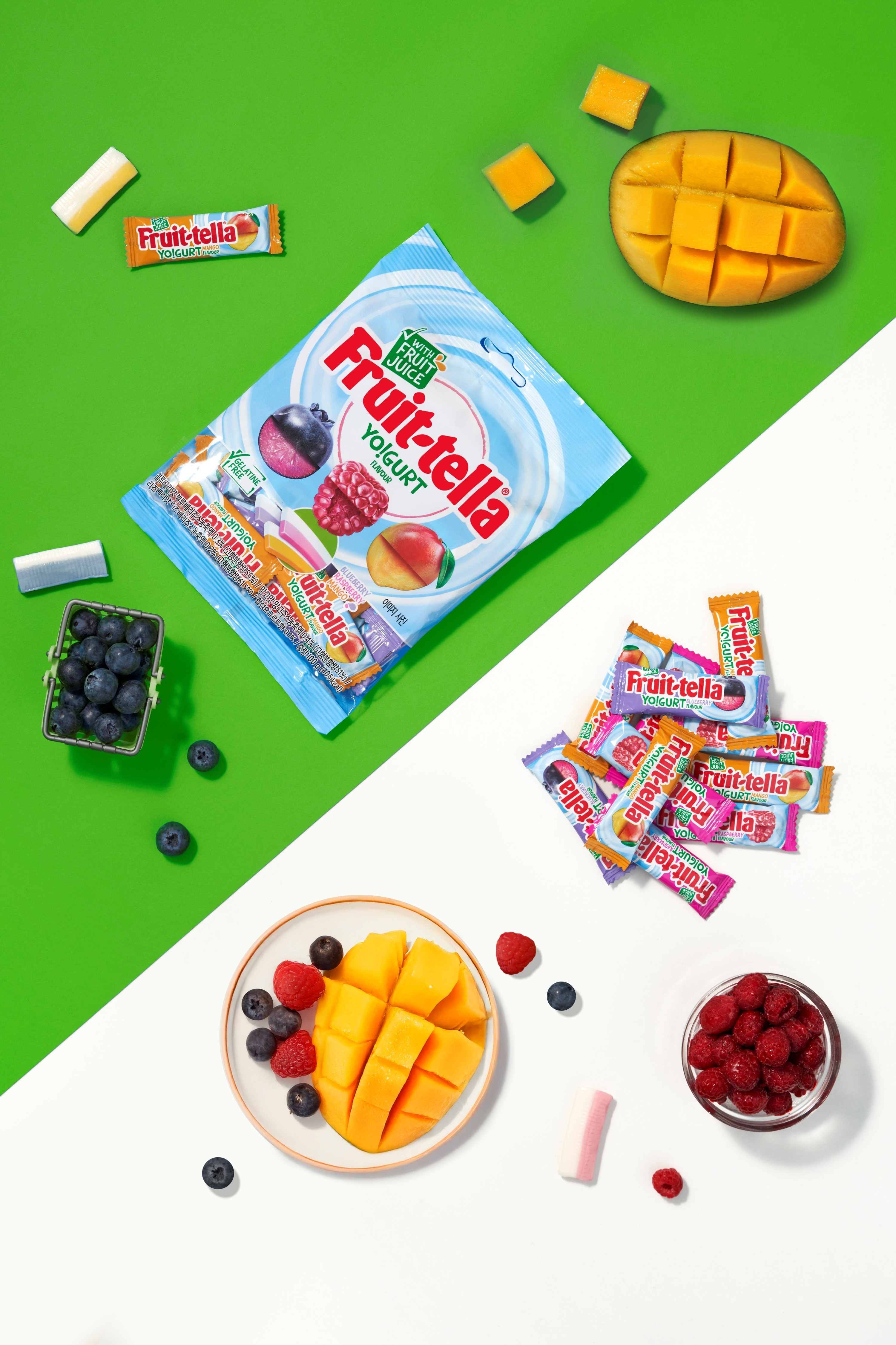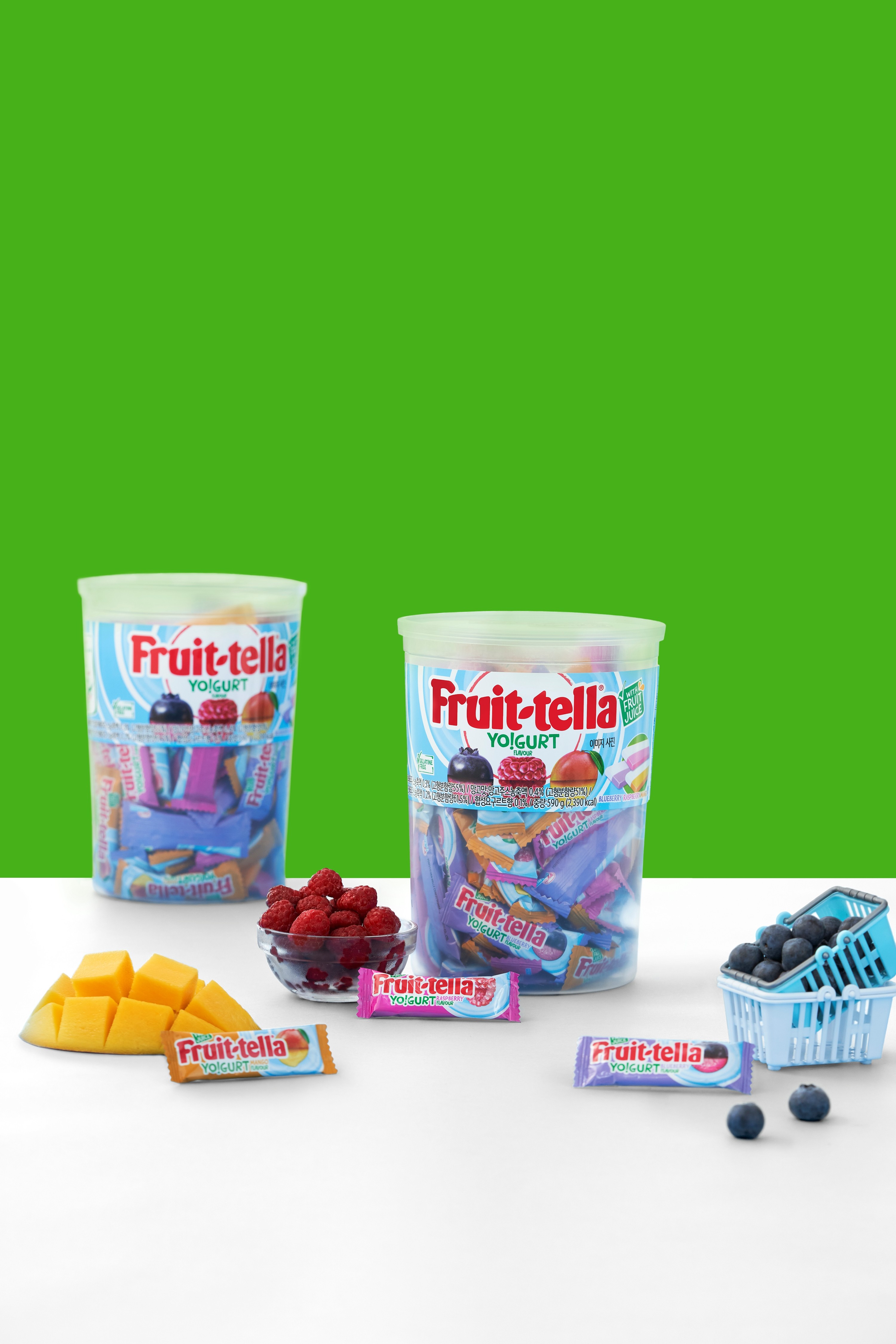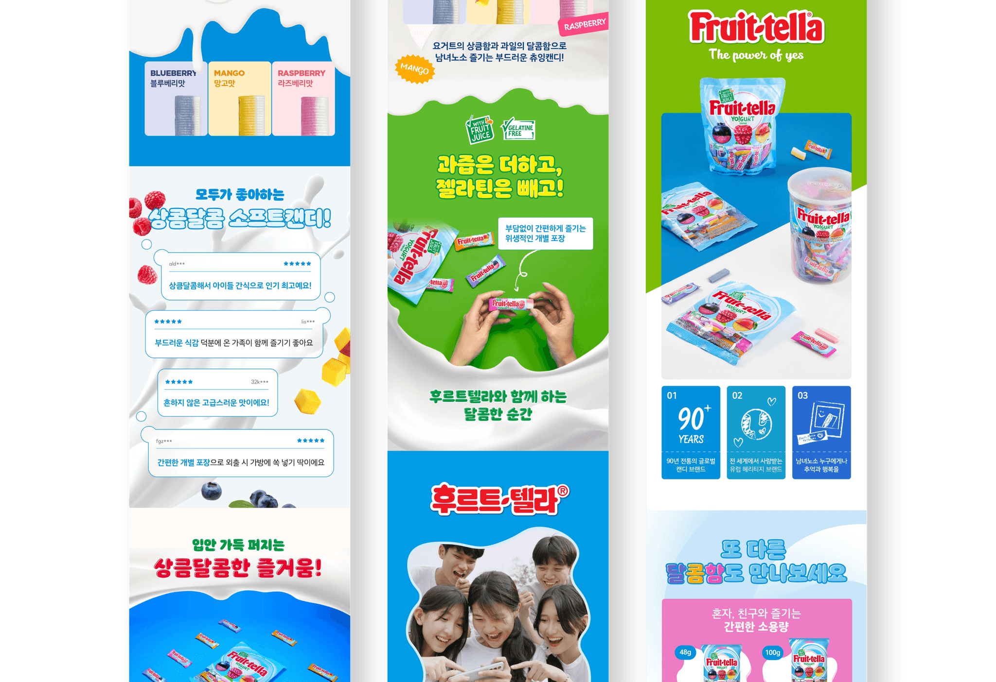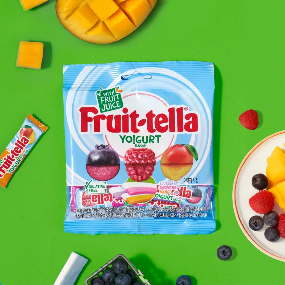 후르트텔라의 요구르트와 라즈베리, 망고, 블루베리 과일의 상큼 달콤한 맛을 강조하기 위해 실제 원물 이미지를 활용하여 조화롭게 표현했습니다. 촬영은 제품별 컨셉을 반영한 세팅과 디테일한 클로즈업 샷을 통해 제품의 강점을 부각시키고, GIF를 활용하여 개별 포장과 3가지 맛을 직관적으로 보여주며 제품의 이해도를 높이며, 소용량과 대용량의 차이를 명확하게 구분하여 소비자들이 쉽게 인식할 수 있도록 했습니다.